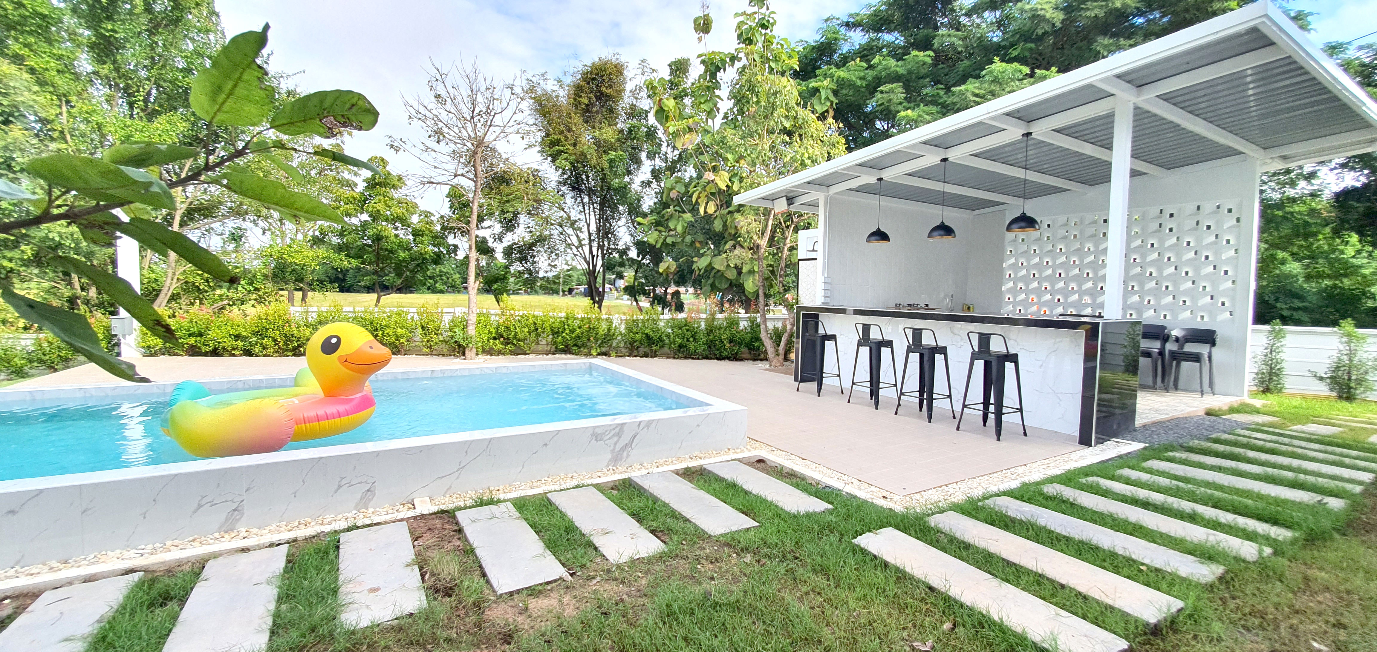 สระว่ายน้ำส่วนตัวใสสะอาด ใช้ระบบเกลือที่อ่อนโยนต่อผิวและดวงตา ขนาด 4 x 10 เมตร พอเหมาะสำหรับว่ายน้ำ แช่น้ำ หรือถ่ายภาพสวยๆ ท่ามกลางสวนเขียวขจี ตอบโจทย์ ที่พัก พิษณุโลก มีสระว่ายน้ำ อย่างแท้จริง